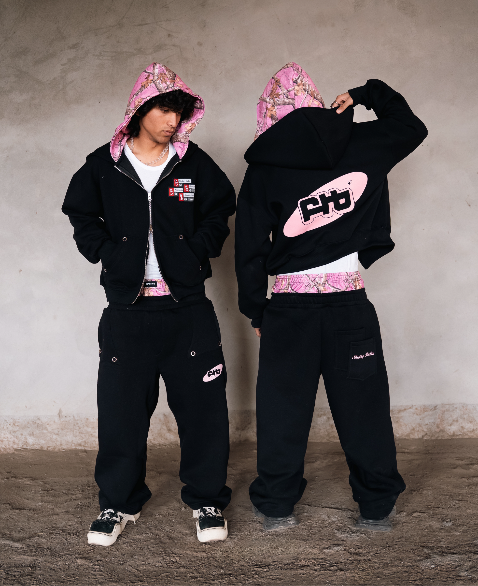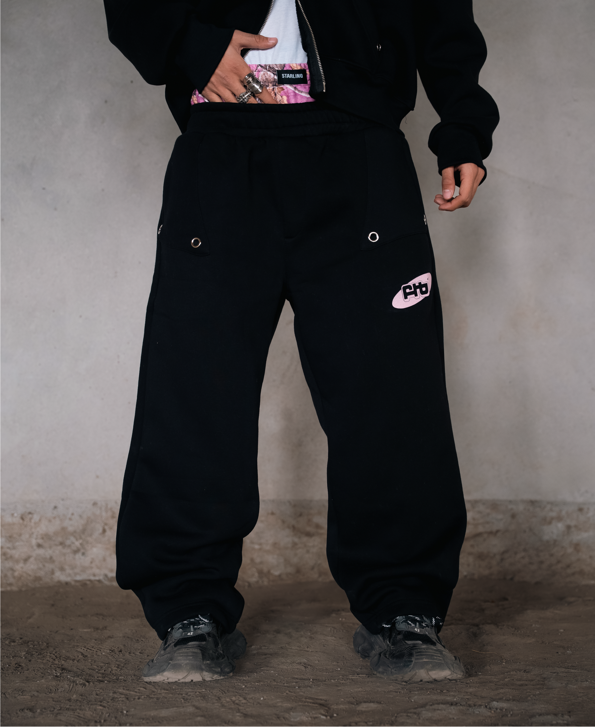 These relaxed-fit track pants feature a double-waist construction, finished with digitally printed pink camo fabric, allowing them to be worn high or sagged as preferred. The front pockets are detailed with patchwork and silver metal eyelets, accompanied by FTB logo, and finished with overlapping double back pockets on one side.