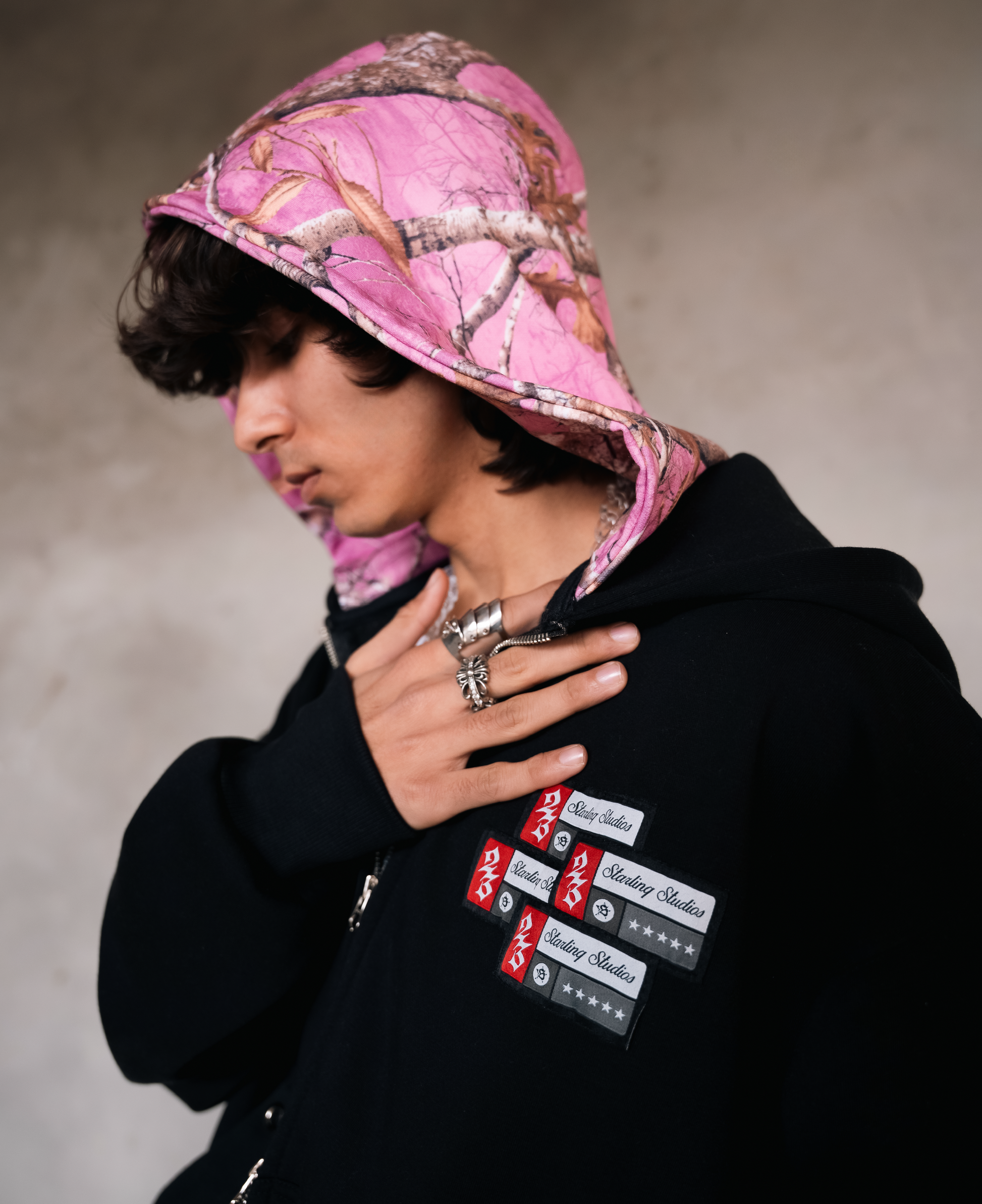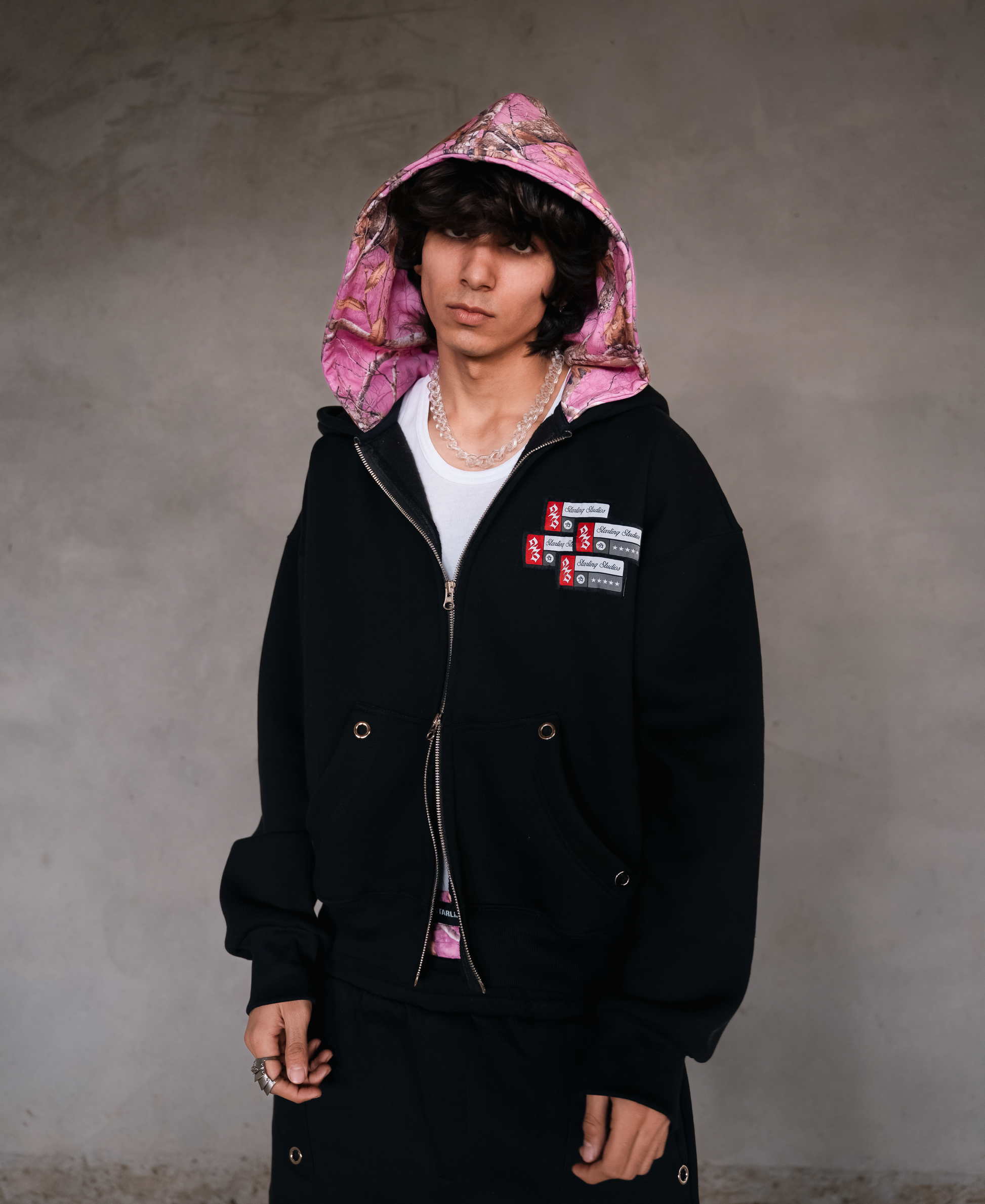 These relaxed-fit zippers feature a dual-layer hood with a digitally printed pink camo fabric. The front pockets are designed with a distinctive pointed edge and detailed with silver metal eyelets. Finished with patchwork on the front, a bold oversized FTB logo on the back, and a two-way zipper for versatile styling.