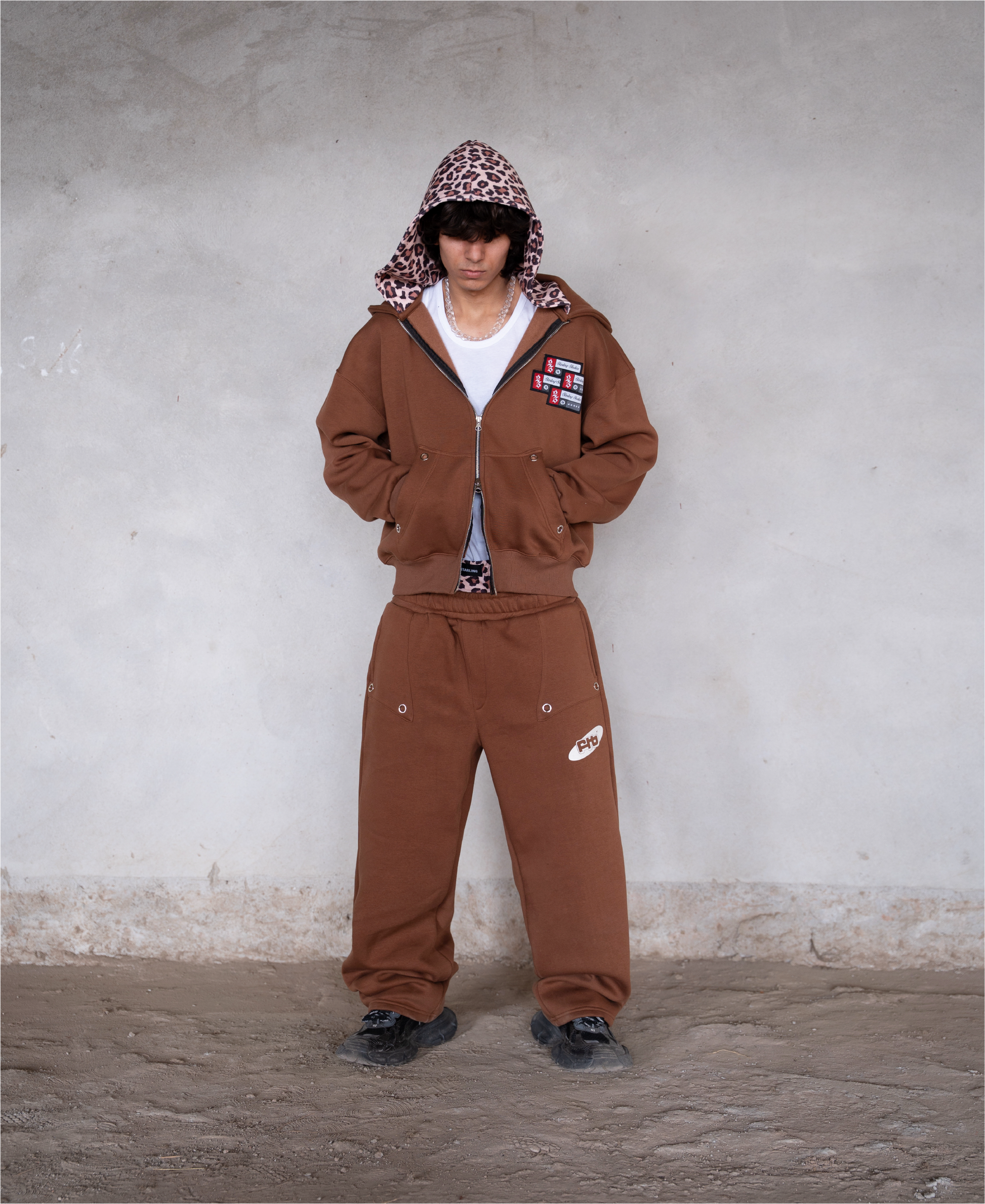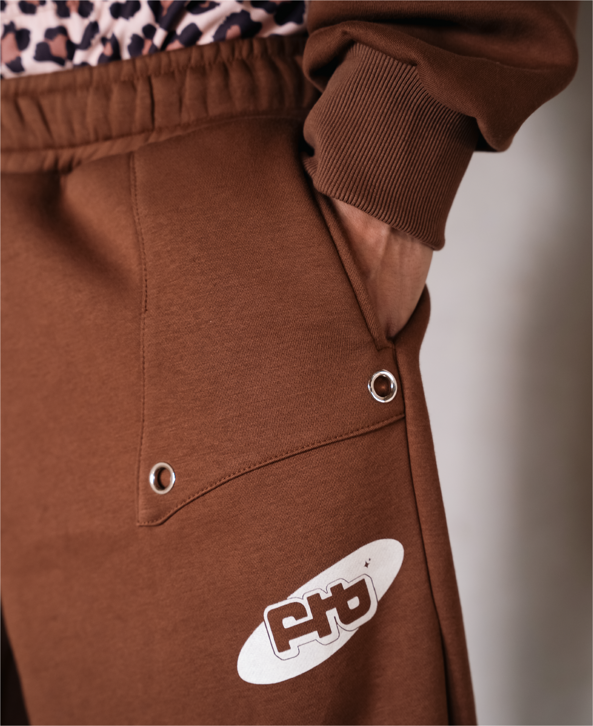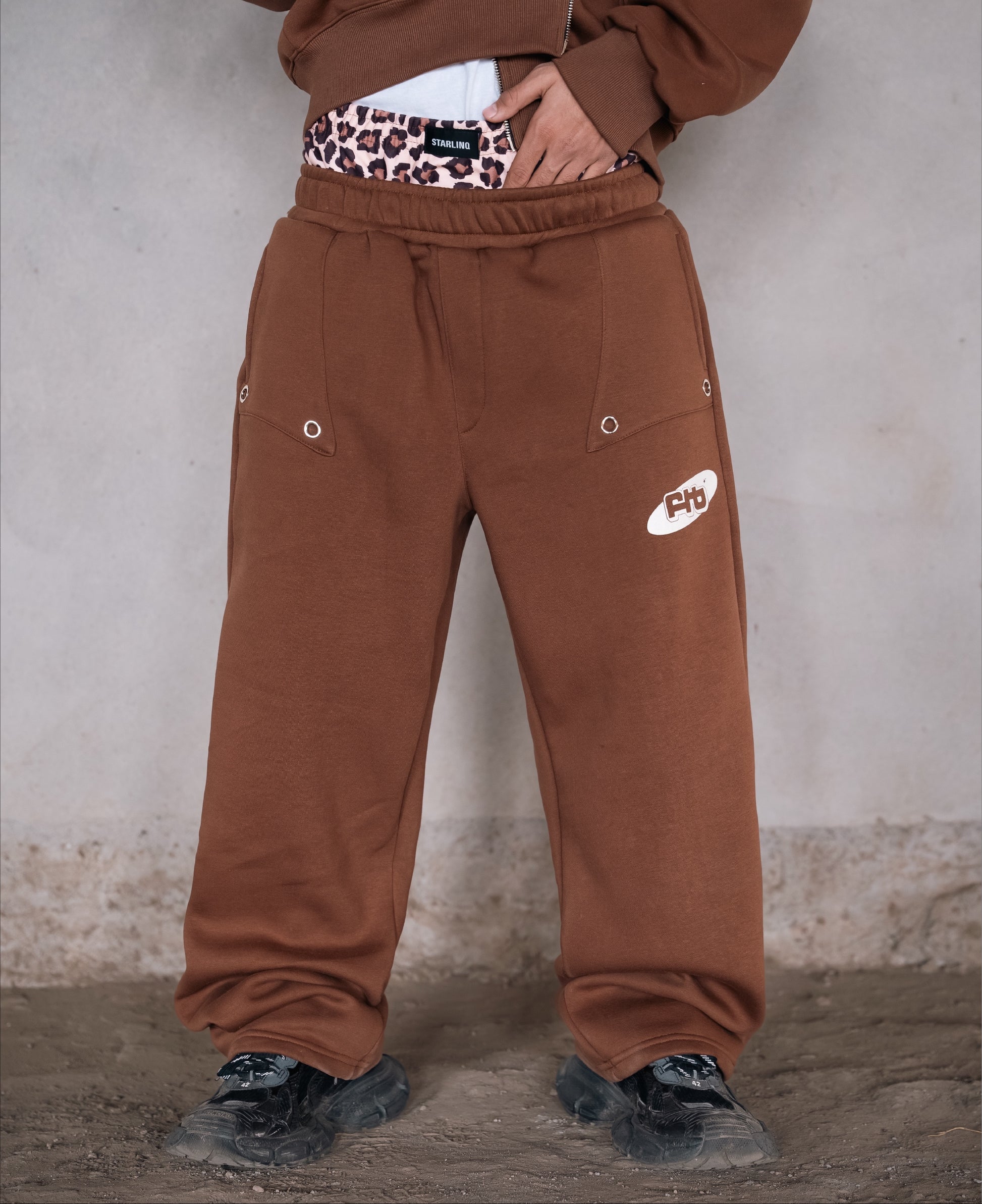 These relaxed-fit track pants feature a double-waist construction, finished with digitally printed leopard print fabric, allowing them to be worn high or sagged as preferred. The front pockets are detailed with patchwork and silver metal eyelets, accompanied by FTB logo, and finished with overlapping double back pockets on one side.