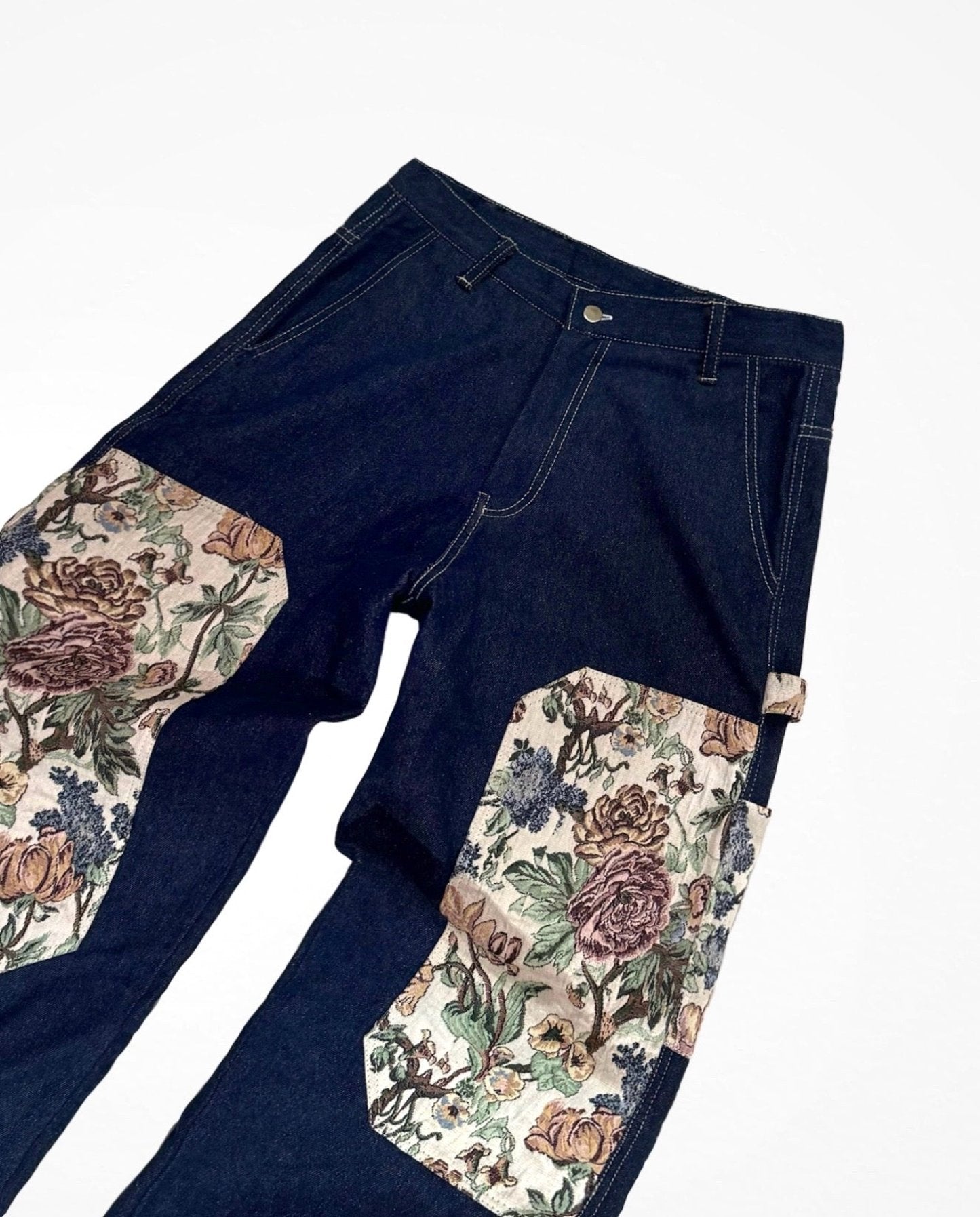 Crafted from premium jacquard fabric, these pants showcase an intricate floral pattern that exudes sophistication and flair. The double-knee design adds durability while enhancing the overall aesthetic with unique utility patchwork, making them a true statement piece.