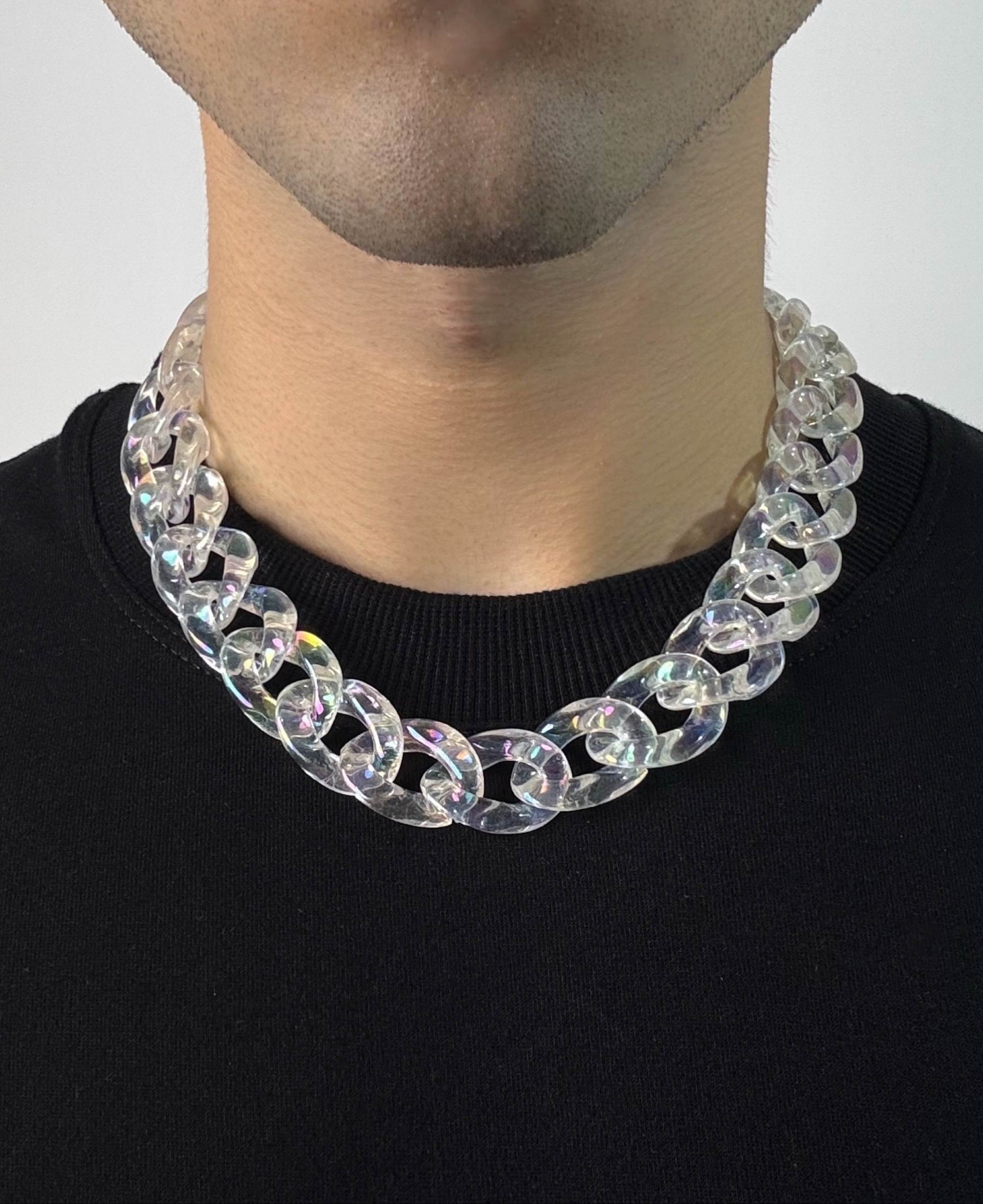 With its holographic transparent finish, it reflects a spectrum of colours, giving it a unique, futuristic edge. Designed as a neckpiece, it adds a subtle yet standout detail that shifts with the light, elevating any look with ease.