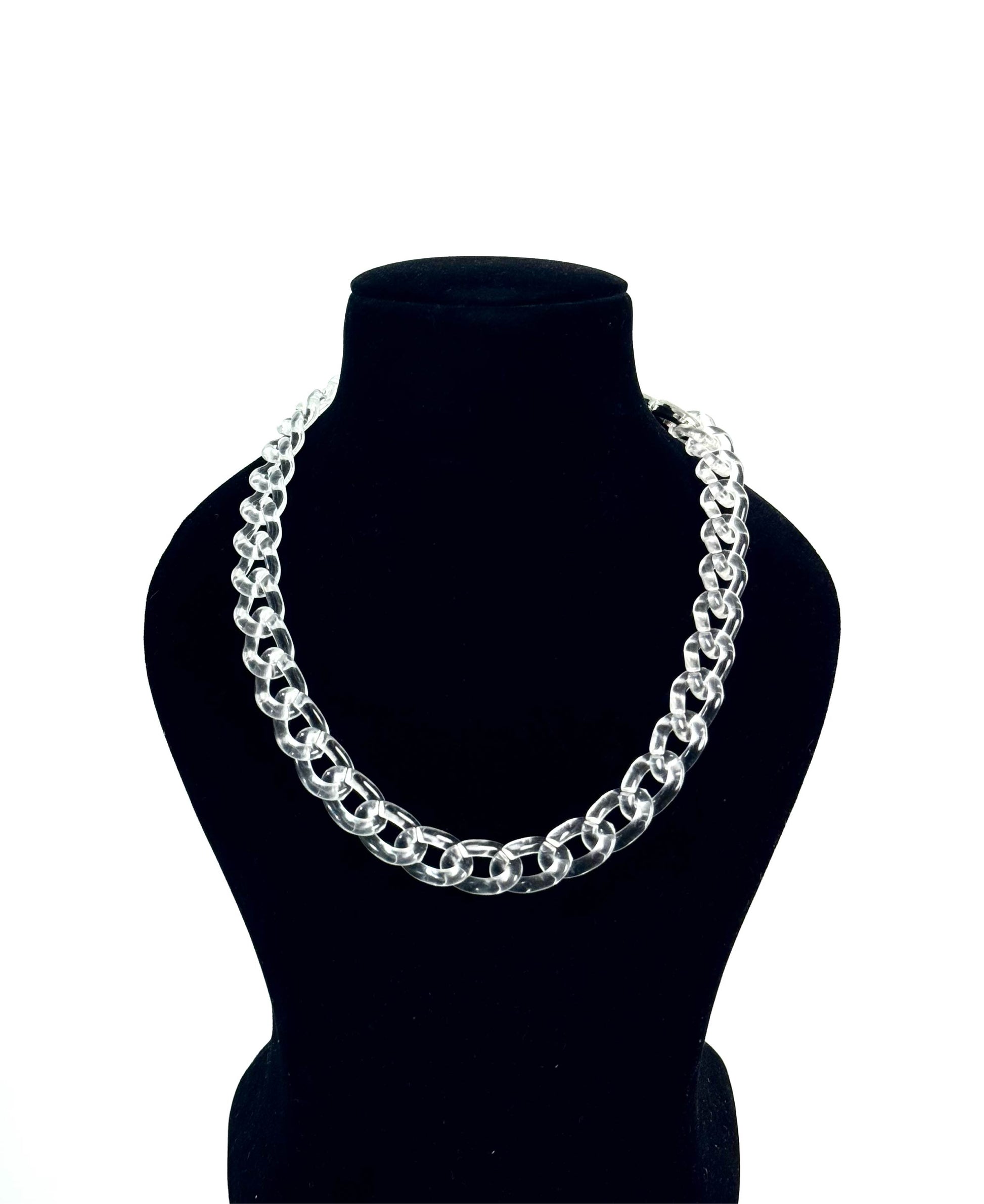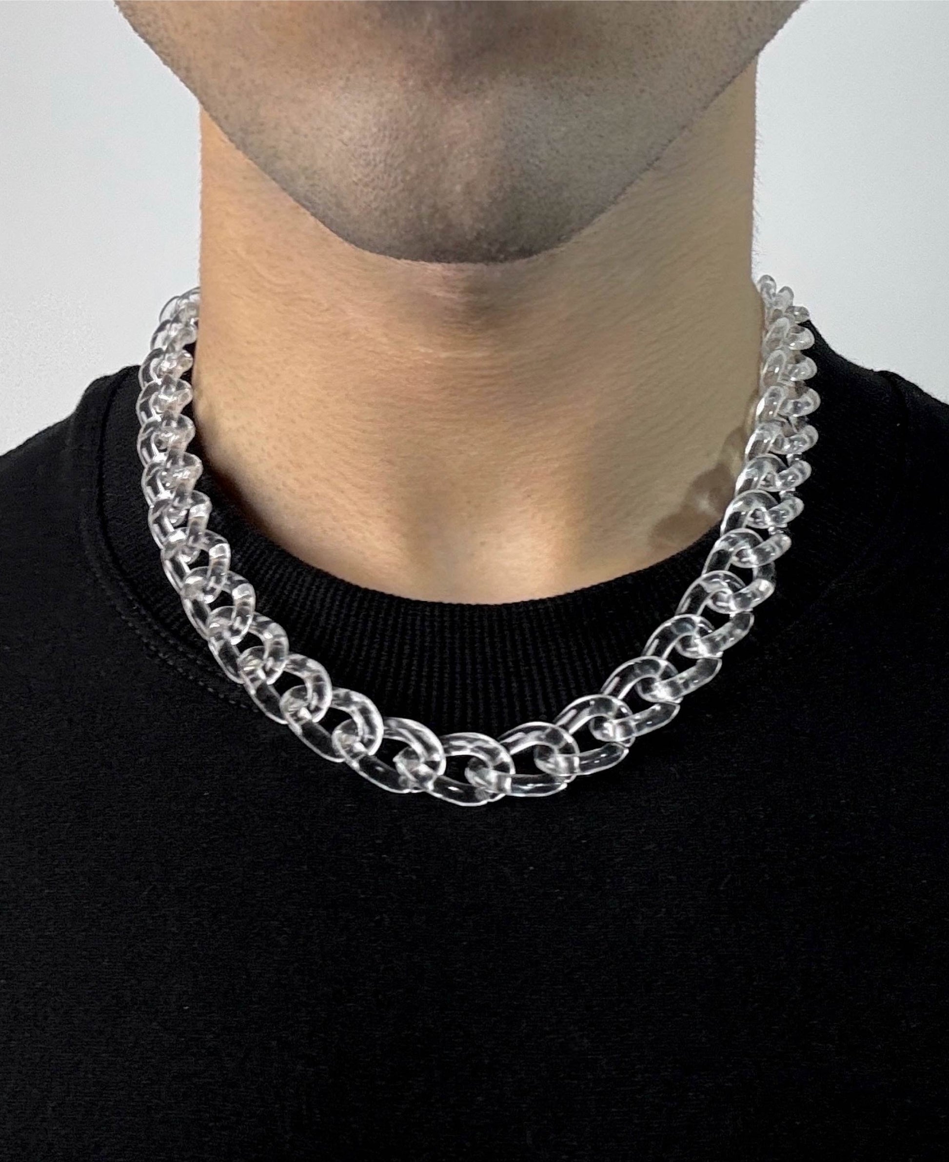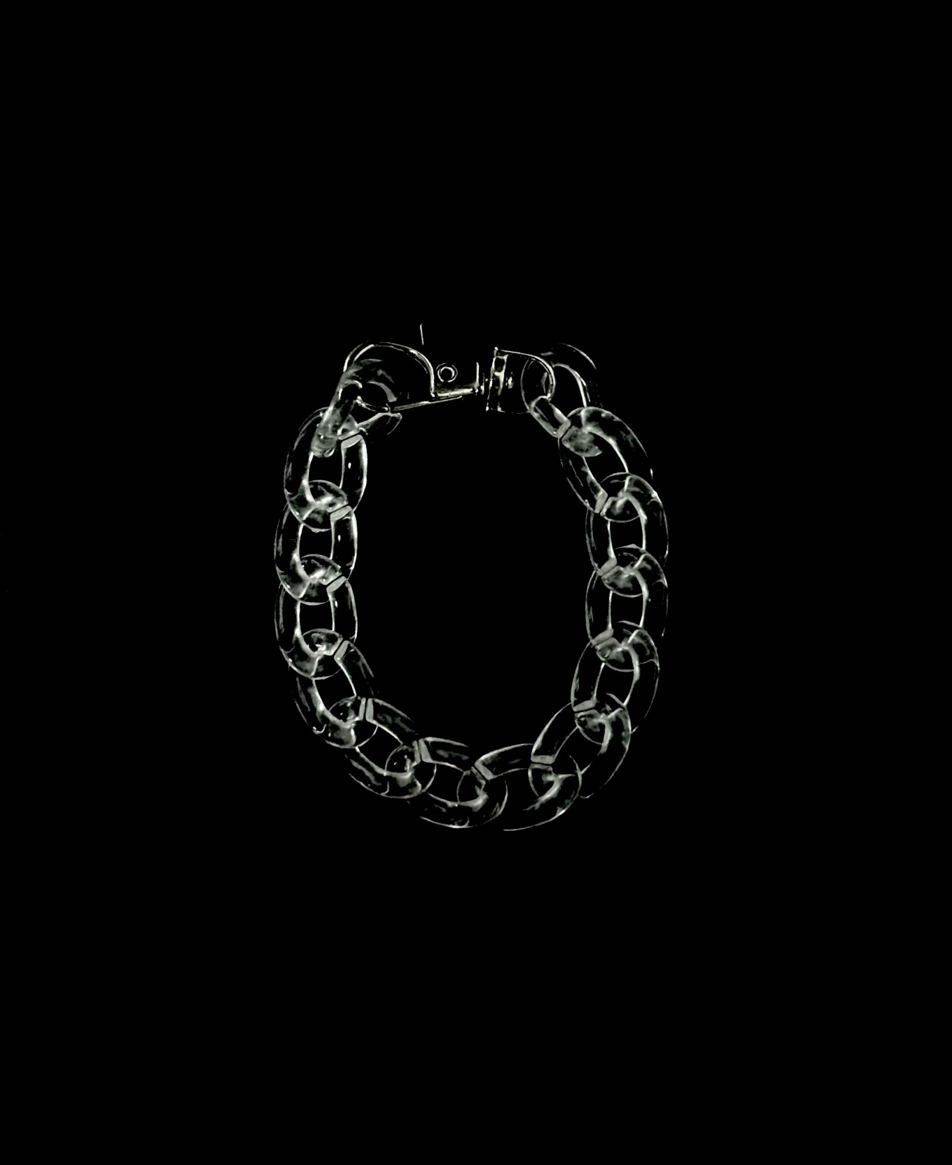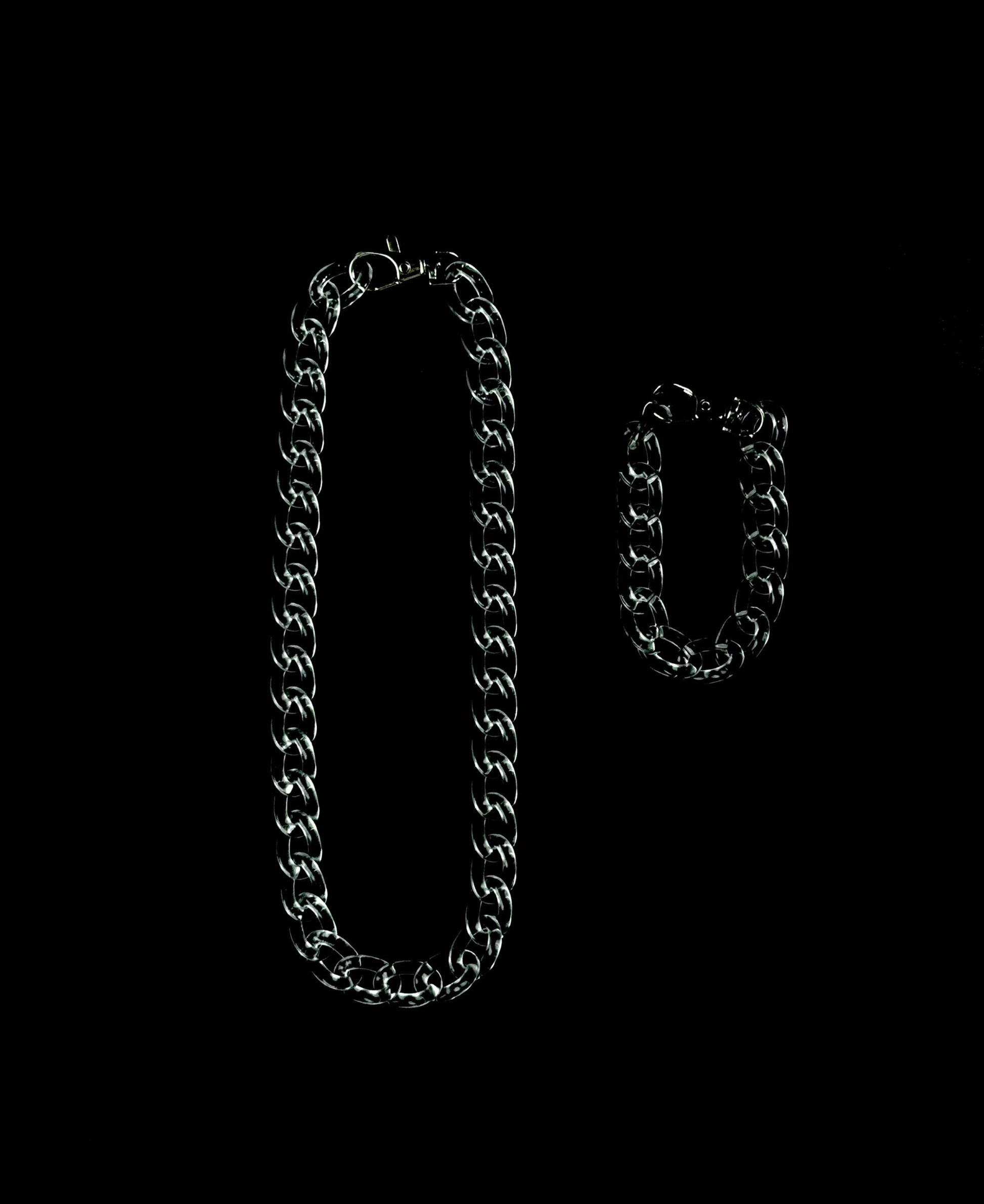 This piece is all about clean minimalism. With its transparent finish, it brings an icy, minimal edge that pairs effortlessly with any fit. Sold as a combo of neckpiece and bracelet, it’s versatile, clean, and built to complete your look.