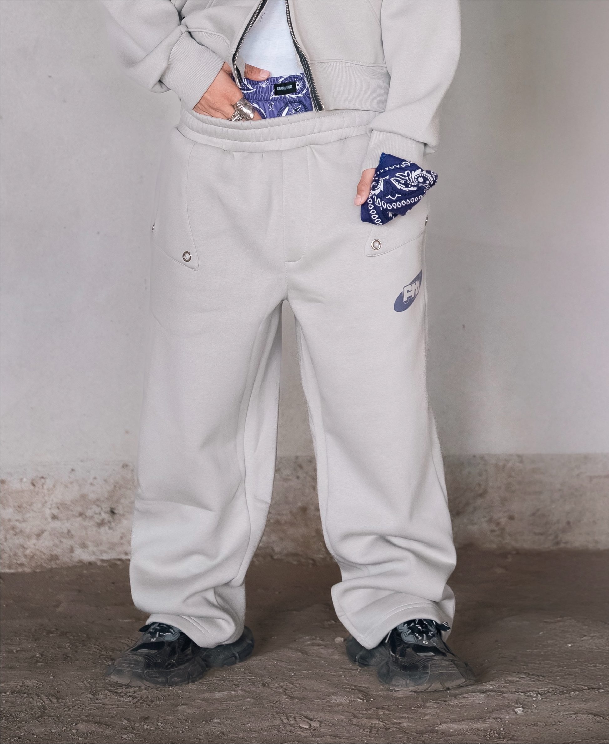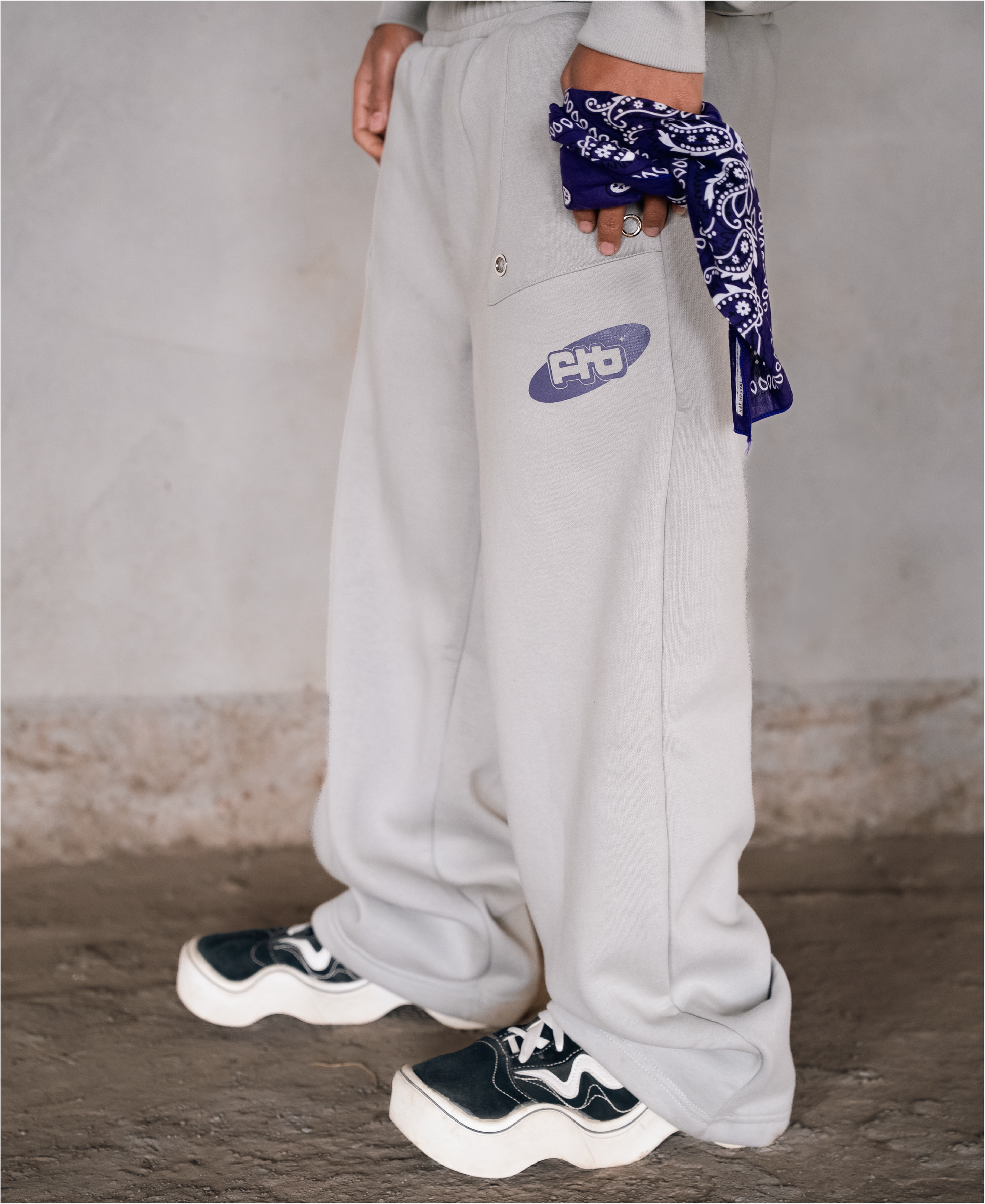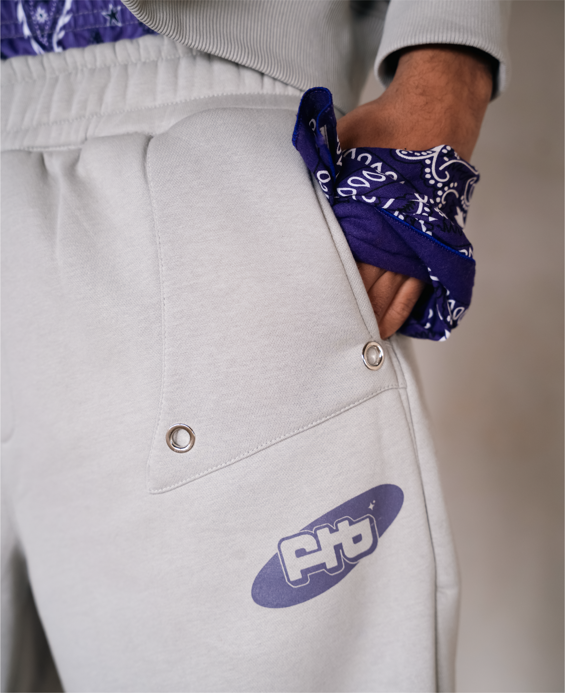 These relaxed-fit track pants feature a double-waist construction, finished with digitally printed purple paisley fabric, allowing them to be worn high or sagged as preferred. The front pockets are detailed with patchwork and silver metal eyelets, accompanied by FTB logo, and finished with overlapping double back pockets on one side.